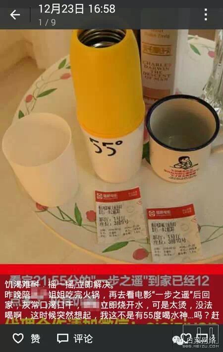 不过不得不承认宣传图片做得很诱人,煞有介事的“食品级材料”“喝烫开水会致癌”“某某设计师精心打造”,最离谱的就是那张“55度是父爱的温度”的漫画了,不过事已至此,这个产品的概念氛围已经打造成功,不可否认在下第一次看的时候也觉得很新奇有点想买,因为平常也是很喜欢购买一些新奇物件的人,但是仔细想过、观察过之后又会觉得不对劲,这个产品的容量、能否保温等等让人觉得没有把握,最终并未出手,过后也便淡忘了。